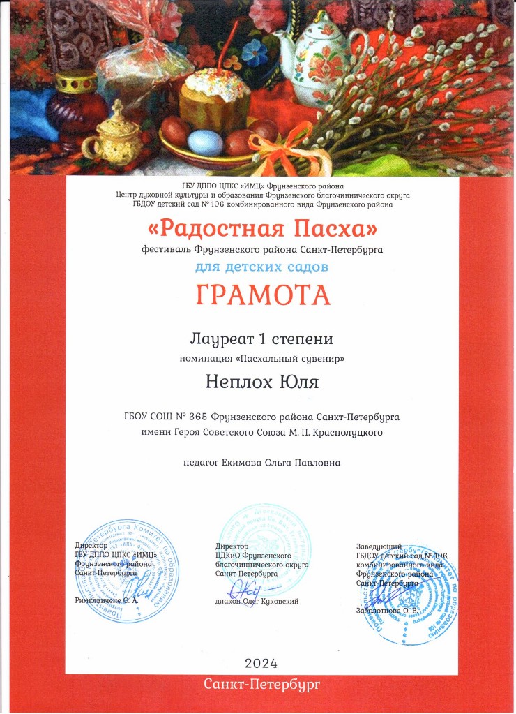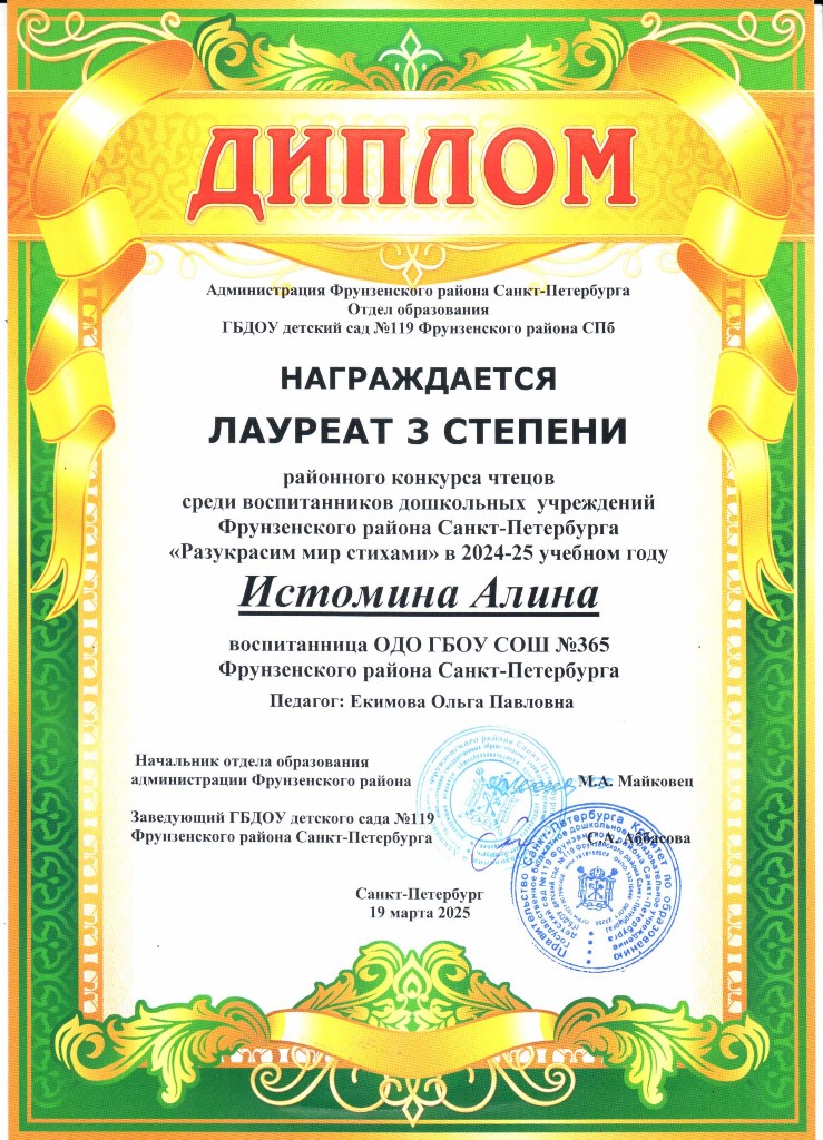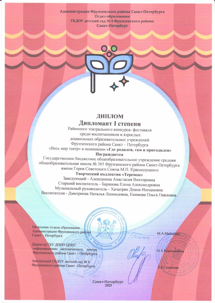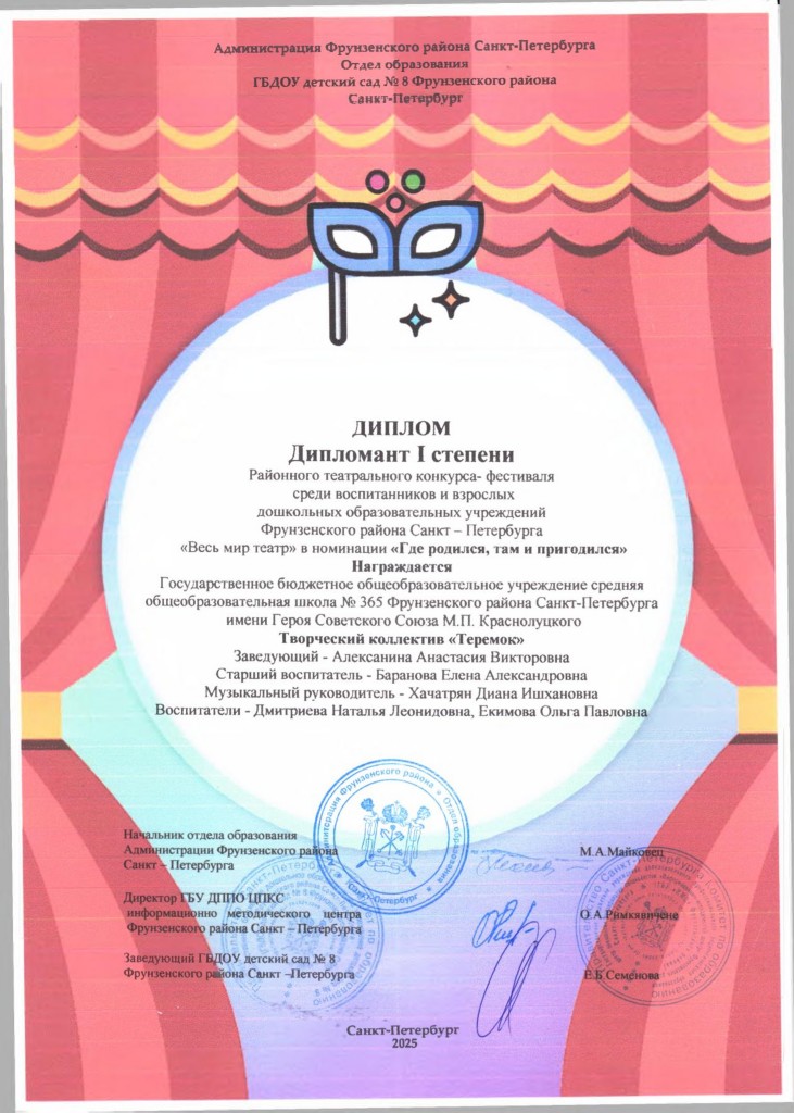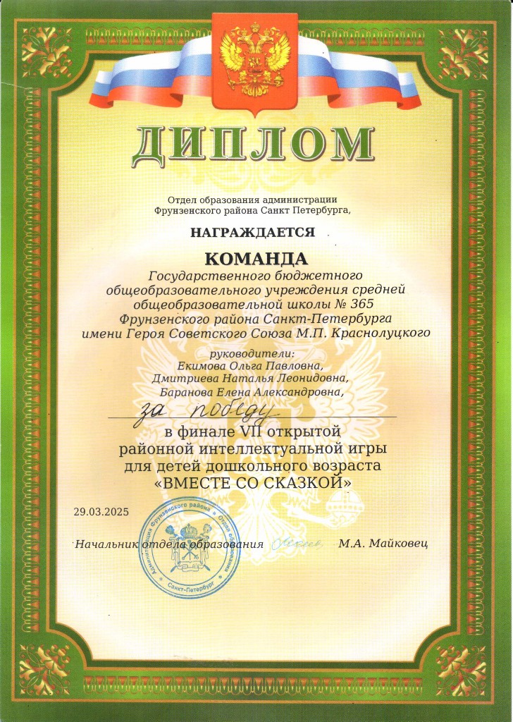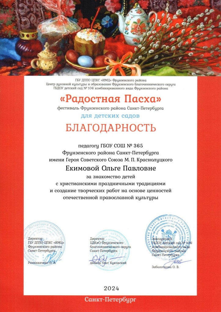 Группа "Божьи коровки": воспитатель Екимова Ольга Павловна награждена дипломом I степени